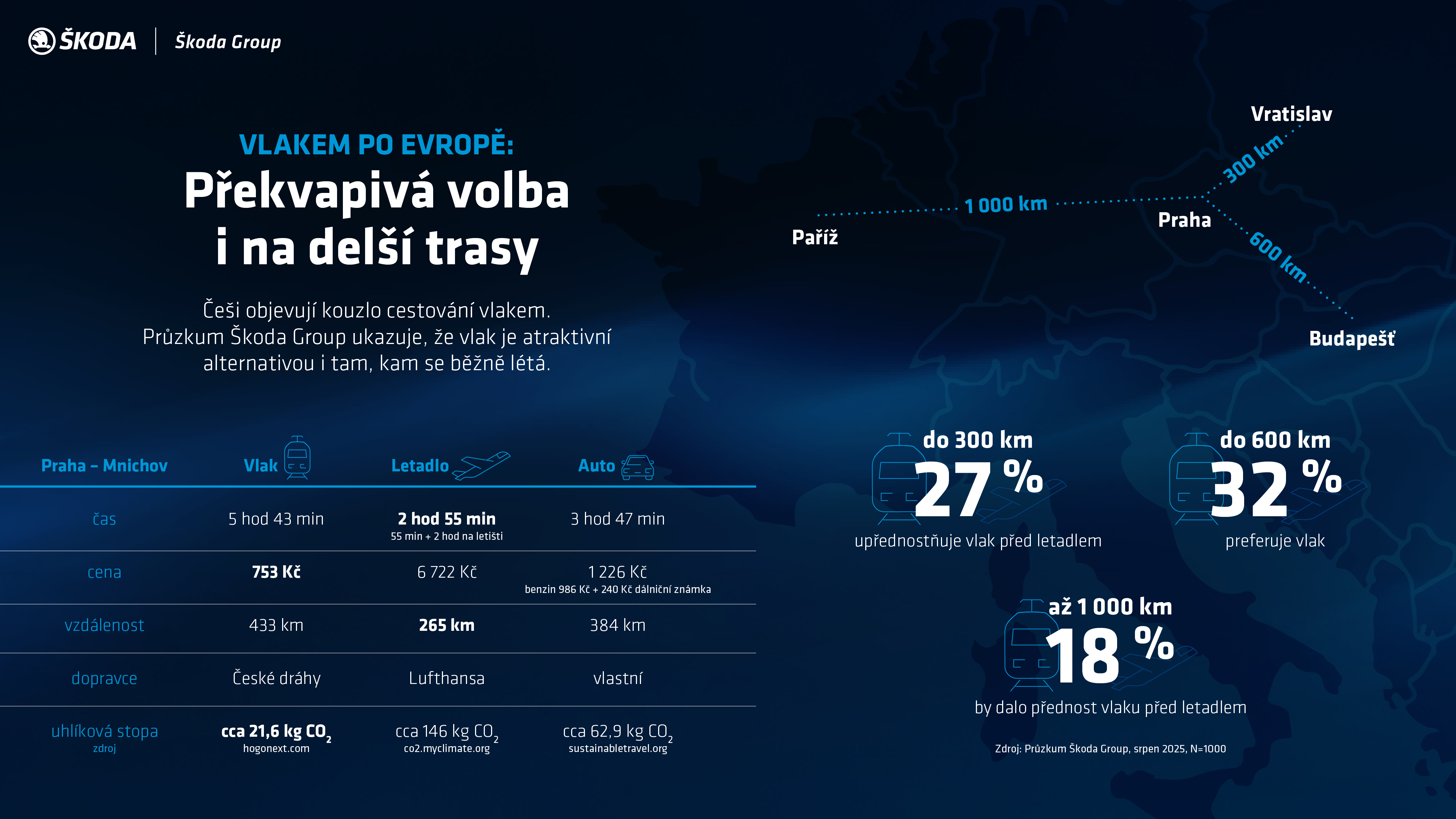 Ačkoliv letadlo nabízí rychlost, vlak se ukazuje jako silná a stále populárnější varianta. Bezmezně věrných letadlu je mezi cestujícími jen 10 %, drtivá většina je otevřená i možnosti jet vlakem. „Náš průzkum odhalil, že pro cesty do 300 km lidé nejčastěji volí automobil. Současně více než čtvrtina (27 %) respondentů uvedla, že pokud mají na výběr, dávají i na kratší vzdálenosti přednost vlaku před letadlem. Pro delší trasy, konkrétně do 600 km nebo také 5 hodin jízdy, je vlak preferovanou volbou pro téměř třetinu (32 %) dotázaných,“ popisuje Milan Kosař, Vice President Marketing & Communications ve Škoda Group a pokračuje. „Co je však překvapivé, je zjištění, že i pro cesty dlouhé až 1000 km, což je pro představu jako z Prahy do Paříže, by vlaku dalo přednost před letadlem 18 % respondentů. To naznačuje, že vlak je vnímán jako komfortní a efektivní způsob dopravy i na trasách, které jsou automaticky spojovány s leteckou dopravou.“