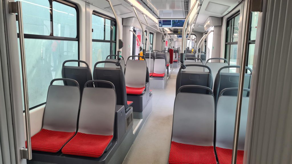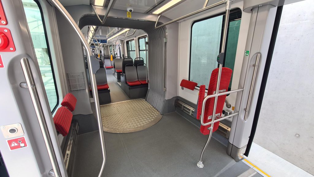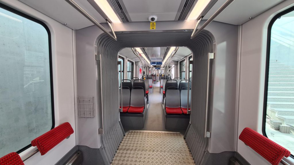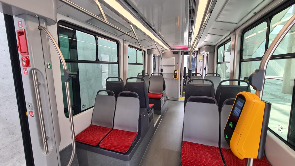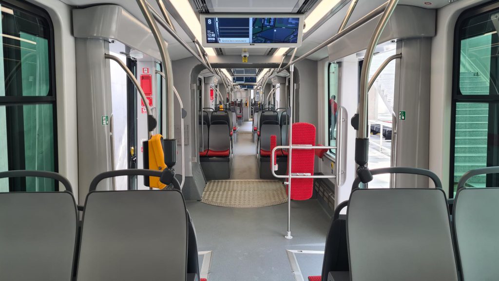 Nová tramvaj má prostorný klimatizovaný interiér vybavený nerezovými madly, širokoúhlými informačními LCD monitory a USB nabíječkami. Ve výbavě nechybí ani Řídící a informační systém RIS2 nebo třeba validátory systému EOC2. Pro přepravu více vozíčkářů má tramvaj celkem čtyři výklopné plošiny. Vůz je také vybaven vnějším i vnitřním kamerovým systémem a částečně ztmavenými bočními okny.