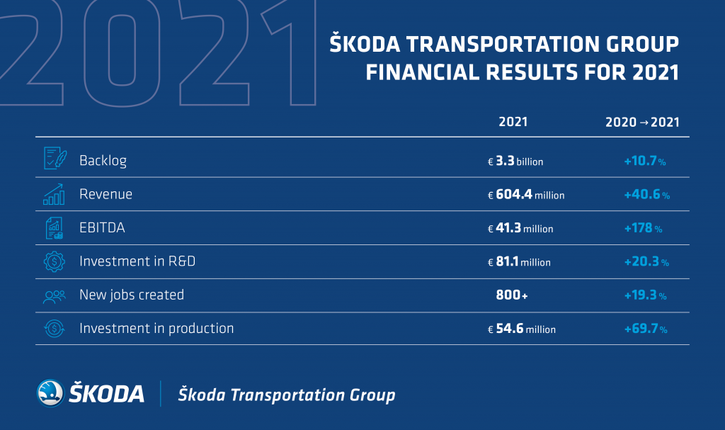 Despite facing tough challenges in 2021, the Škoda achieved solid financial results, completed a number of important projects and won major new contracts. Škoda Transportation Group achieved a consolidated net income of € 22.6 million and overcome the negative effects of the covid pandemic. These had the biggest impact in 2020. EBITDA increased by 178% to € 41.36 million. Škoda also recordeDespite facing tough challenges in 2021, the Škoda achieved solid financial results, completed a number of important projects and won major new contracts. Škoda Transportation Group achieved a consolidated net income of € 22.6 million and overcome the negative effects of the covid pandemic. These had the biggest impact in 2020. EBITDA increased by 178% to € 41.36 million. Škoda also recorded a year-on-year increase in sales, which increased by 40.6% to € 604.4 million. The covid-19 disease pandemic and the rise in energy and raw material prices had a major impact on the group’s operations and finalising of orders.d a year-on-year increase in sales, which increased by 40.6% to € 604.4 million. The covid-19 disease pandemic and the rise in energy and raw material prices had a major impact on the group’s operations and finalising of orders.